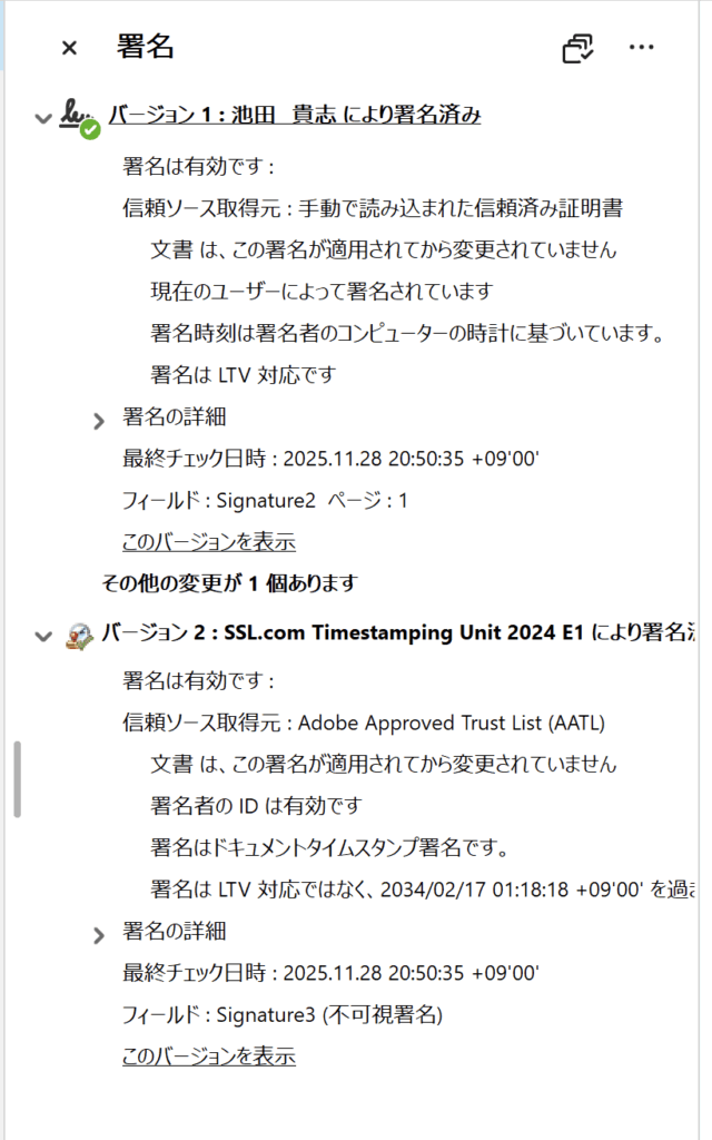 署名パネルで付けられた電子署名を見てみると、新しい項目が一個増えていて、これを展開して見てみると「署名はドキュメントタイムスタンプ署名です。」という説明文があり、タイムスタンプという電子署名が追加されたことがわかります。