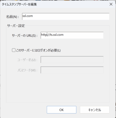 「新規」をクリックして右の画像に示すように入力します。「名前」の欄はわかりやすいものでなんでもいいのですが、「サーバーのURL」の欄は間違えないように「http://ts.ssl.com」と入力してください。