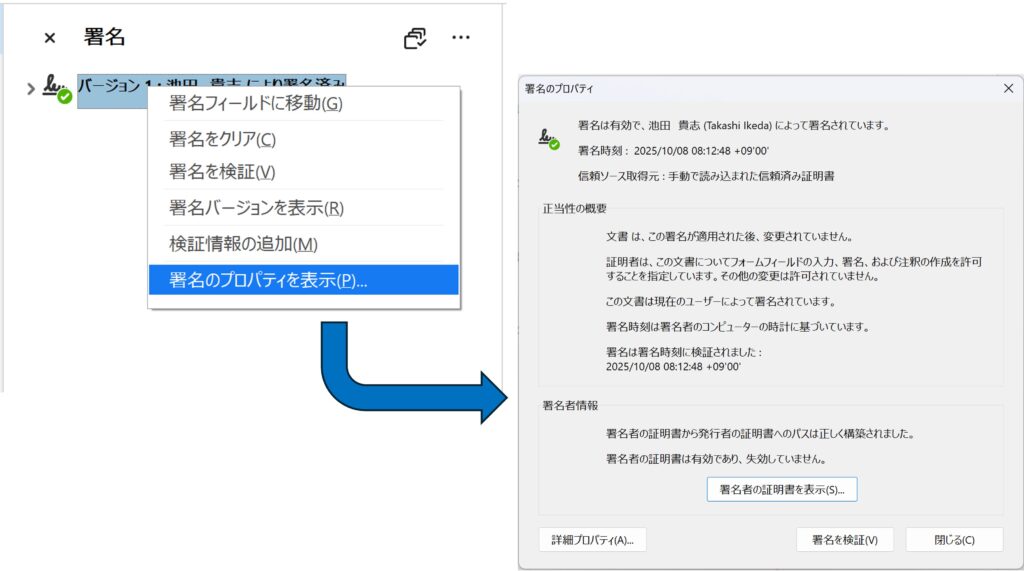 この場合で言うと、署名時刻が2025年10月8日 8時12分48秒っていうことになっているから、池田貴志さんはこの時にこの契約書に合意した、ということになるのか。