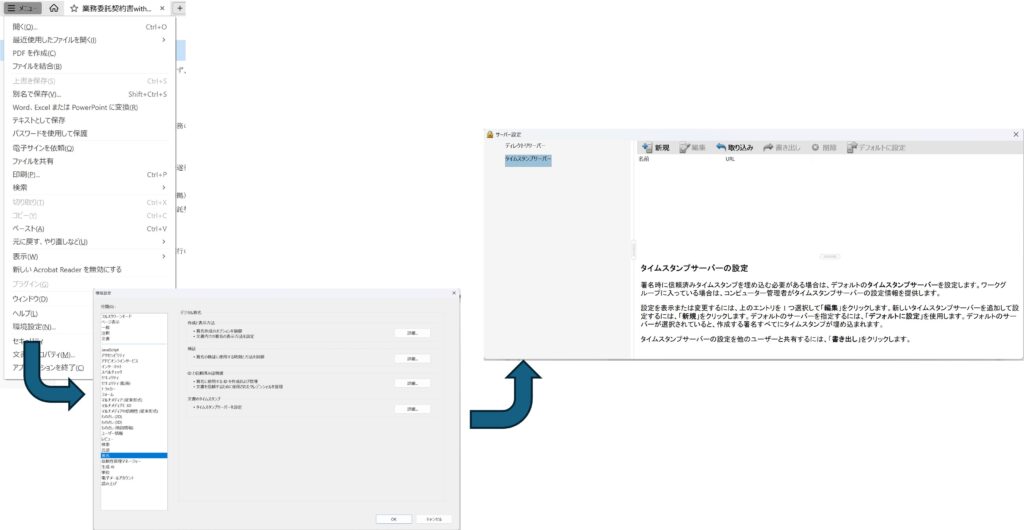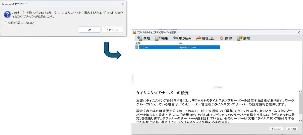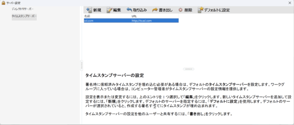タイムスタンプサービスの設定画面に辿り着くには、「メニュー」の「環境設定」画面で「署名」を選択して表示される画面の中から「文書のタイムスタンプ」の「詳細」をクリックします。すると下図のような「タイムスタンプサーバーの設定」という画面が表示されます。