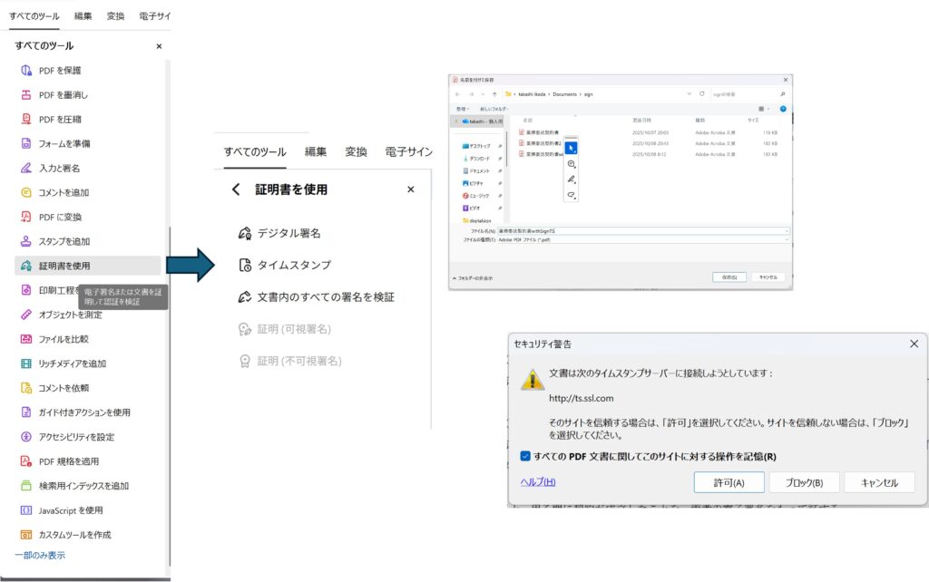 Acrobat Readerの「すべてのツール」から「証明書を使用」を選択します。表示されていないばあいには「さらに表示」をクリックして広げます。「証明書を使用」の画面で「タイムスタンプ」を選択します。すると「名前をつけて保存」の画面が表示されますが、この画面で別のファイル名に変えて保存してもいいですし、同じ名前でそのまま上書きするのでも構いません。「保存」をクリックすると「文書は次のタイムスタンプサーバに接続しようとしています。」と表示されることがあります。タイムスタンプサービスに電子署名をつけてもらう依頼を出しているためです。指示に従って「許可する」をクリックします。これで文書にタイムスタンプが付けられます。