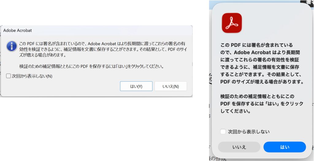 ところでさ、実際に「ssl.com」でタイムスタンプを打ってみると、こんな補足情報がどうのこうのなんてメッセージが表示されちゃうんだけど、これって「ssl.com」のサービスに何か問題があるってこと?PDFのサイズが増えることがあるって、「はい」をクリックした方がいいのか「いいえ」を選択しても構わないのかよくわからないんだけど。