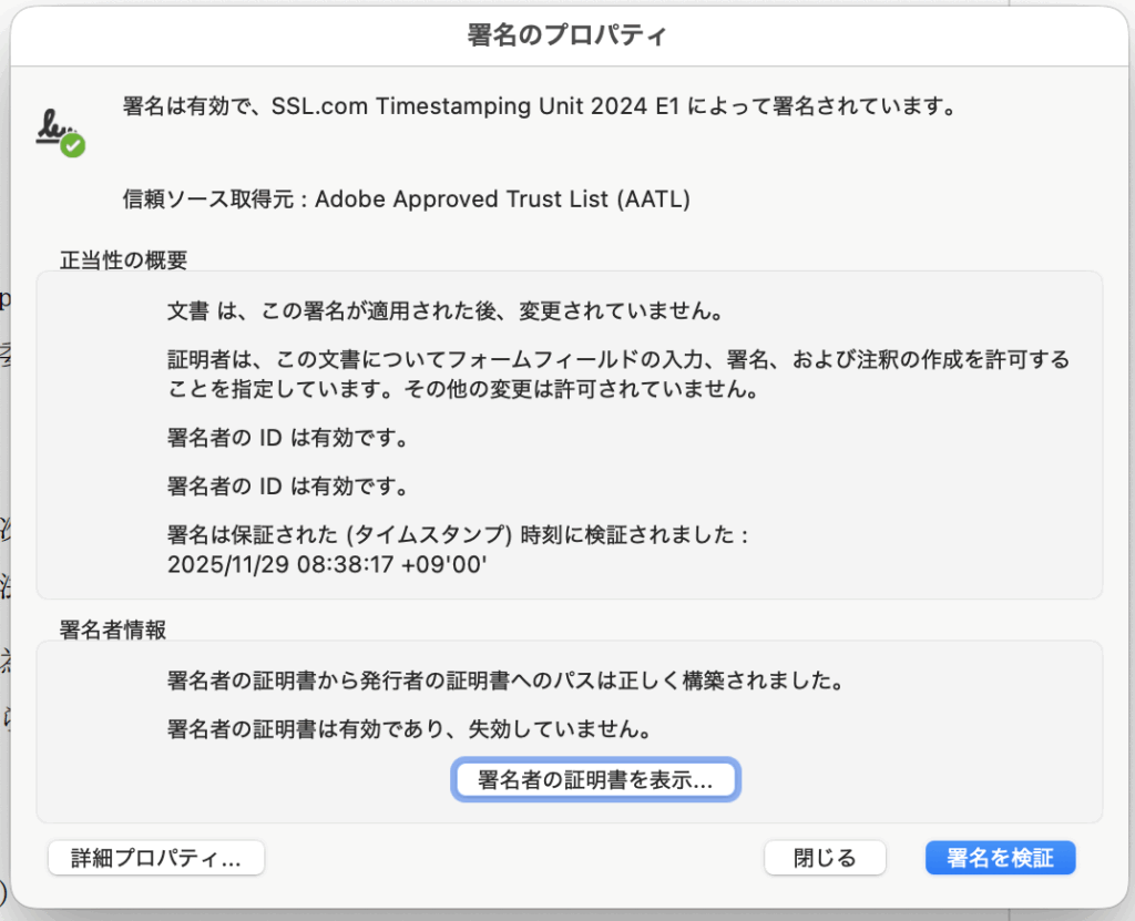 新しくできた方の「署名のプロパティ」で見てみると、新しい日付の「署名は検証された(タイムスタンプ)時刻に検証されました。」が追加されているね。これは結構簡単だし、無料で利用できて文書の信頼性が増すのならお手軽でいいね。