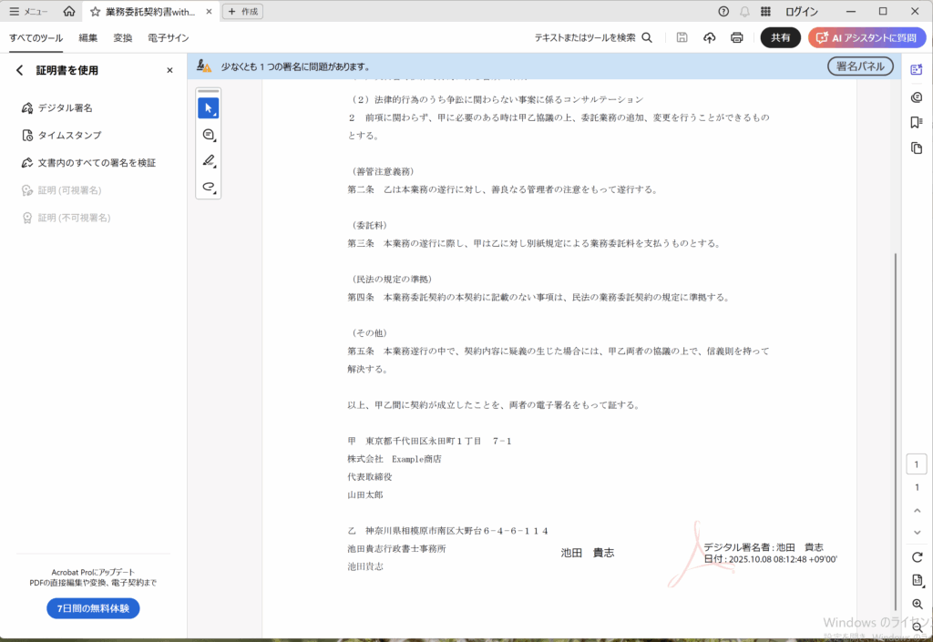 はい、なんとか電子署名をつけることができましたね。今回のPDFファイルは「業務委託契約」ですから、委託元にも電子署名をつけてもらう必要があります。そのときにTAKASHI IKEDAさんの電子署名が正しいものであることを確認してもらう必要がありますが、場合によってはその相手側にも今回と同じ手順を踏んで、SECOMの証明書を信頼済み証明書のリストに登録してもらう作業が必要になってきます。