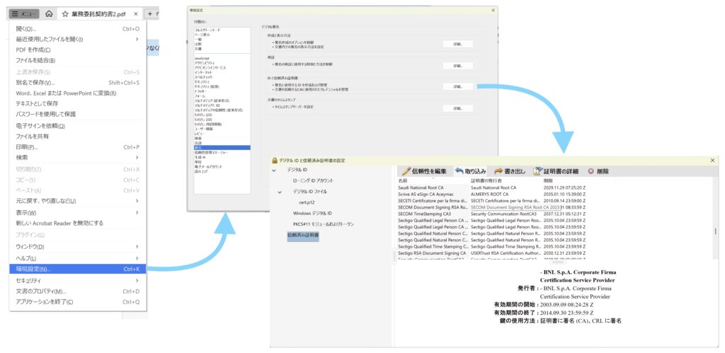 その中の「IDと信頼済み証明書」の「詳細」をクリックして「デジタルIDと信頼済み証明書の設定」画面を開きます。SECOMの公開鍵情報をここに登録すれば、SECOMの電子署名の正当性を確認できるようになり、TAKASHI IKEDAさんの電子署名も本物であることが確認できるようになります。そこで、次の手順で先ほどダウンロードしてきたSECOMの「自己署名証明書」を登録しましょう。