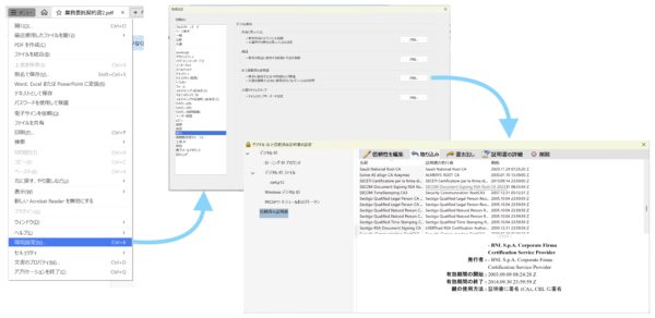 SECOMの電子署名がなりすましによるものではないことを証明するには、正しいSECOMの公開鍵で確認すればよいのです。正しいSECOMの公開鍵の入手方法としては、別途SECOMのサイトからダウンロードするという方法があります。今回はその手順をご紹介して、Acrobat ReaderがSECOMの電子署名を正しく評価できるようになるところまでをみていきましょう。