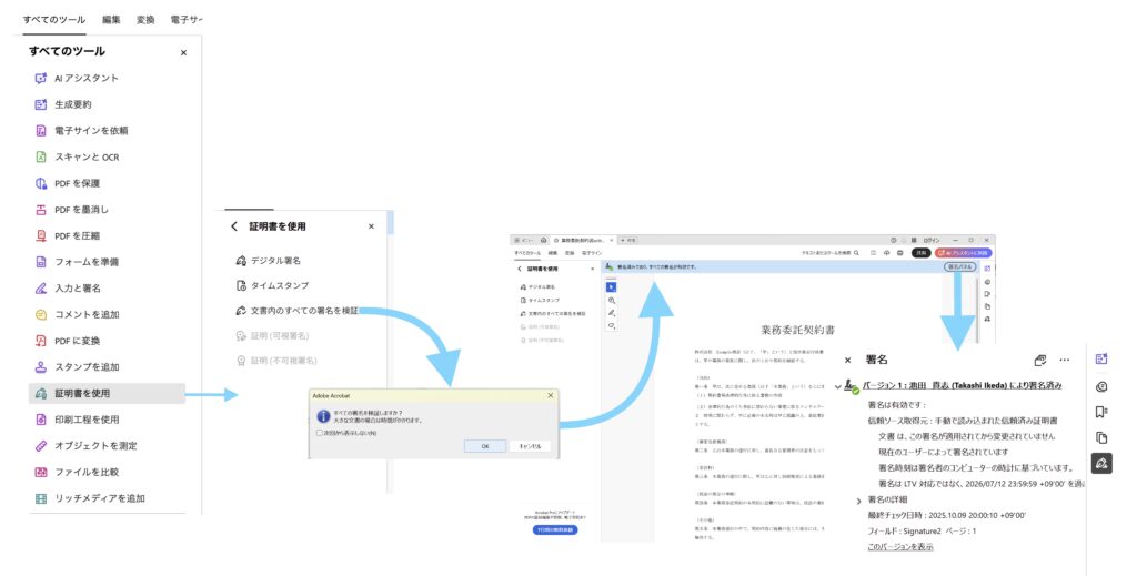 えっと、Acrobat Readerの「すべてのツール」で「証明書を使用」を選択して、「文書へのすべての署名を検証」をクリックっと。